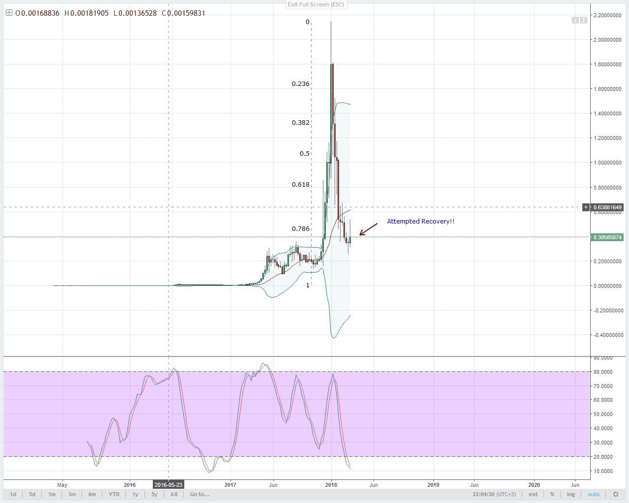 NEO также находится на грандиозном спаде. Альткоин потерял приблизительно 80% своей стоимости. Цены на NEO фактически находятся ниже средней BB.