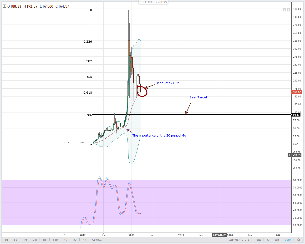 Во-первых, если эта неделя закончится закрытием цены ниже $200, я могу сказать вам однозначно, что следующим пунктом назначения станут $100. Если мы возьмем любой другой случай даже из других ценных бумаг или активов, любой сильный прорыв ниже уровня 61.8% фибоначчи означает большую возможность тестирования цен на 78.6% фибоначчи.