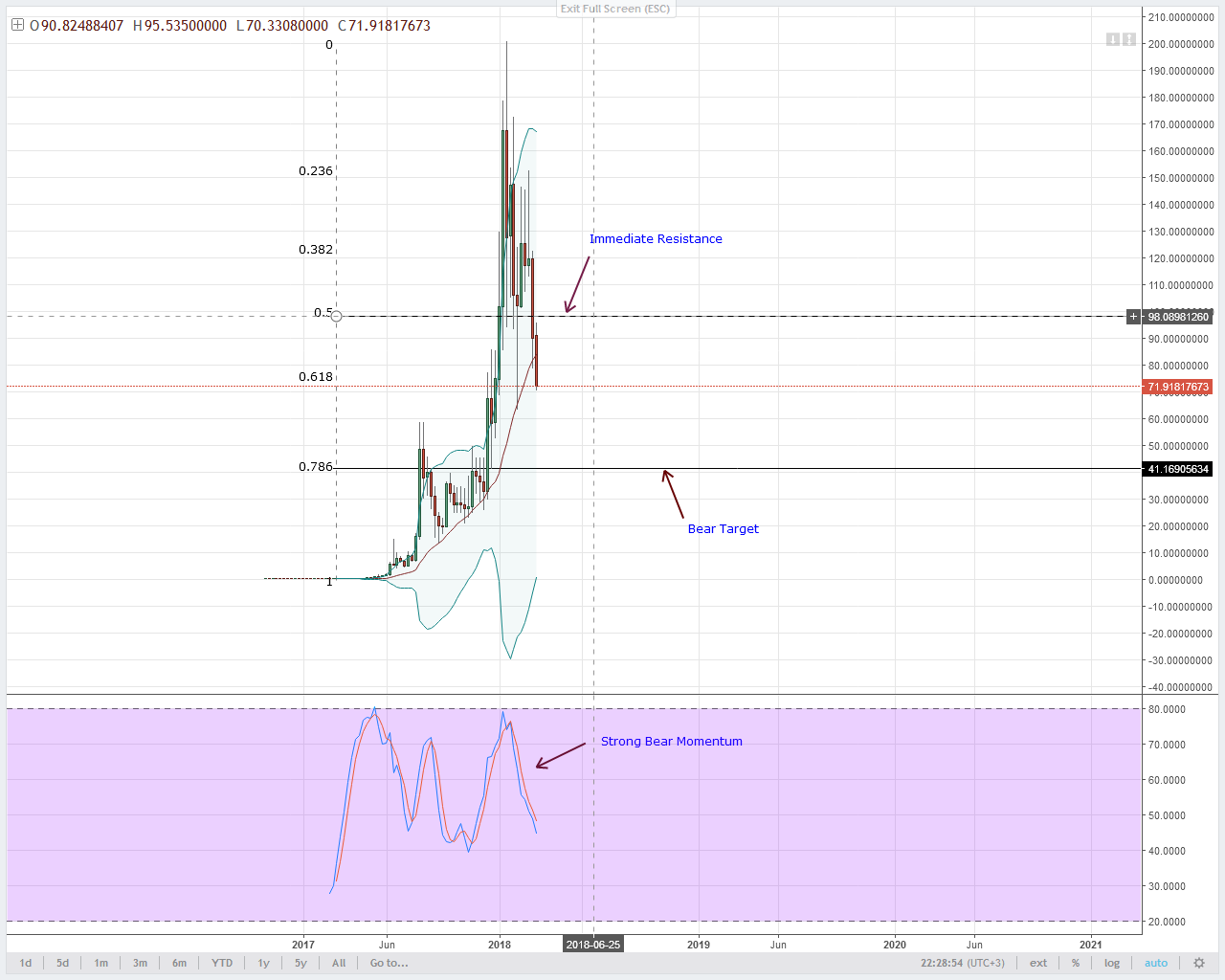 Медвежье давление высоко, продавцы полностью доминируют. Я рекомендовал бы короткие входы на каждом максимуме на стохастике с амбициозными целями в $40 или $55.