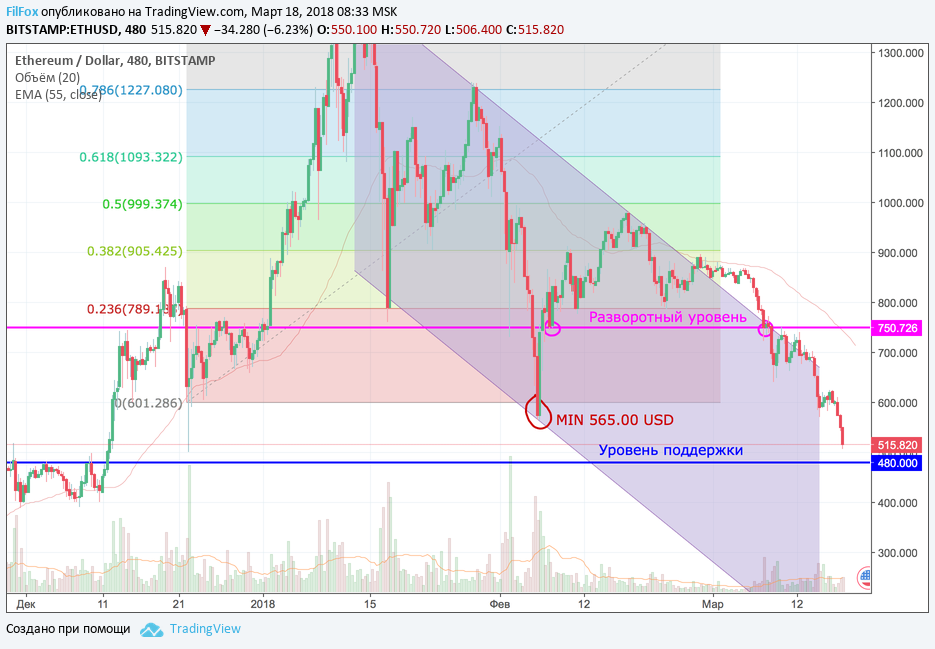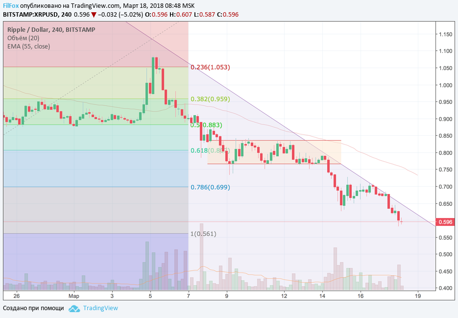 Если оценивать падение цены за неделю в процентном соотношении, то Ethereum потерял около 30%, а Bitcoin и Ripple примерно одинаково, по 23%. Поэтому BTC и XRP ещё не обновили ключевые минимумы от 6 февраля, но подобрались к ним на величину одного медвежьего импульса. Поддержкой для рипл может выступить уровень, чуть выше точки разворота от 06.02.2018, где-то в области 0.580 USD.