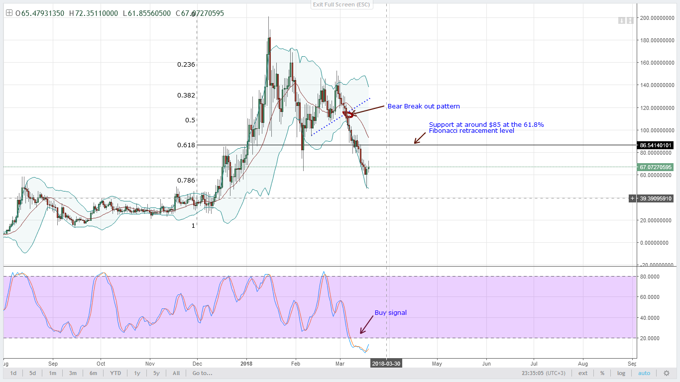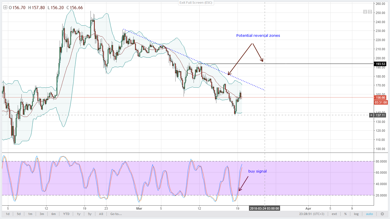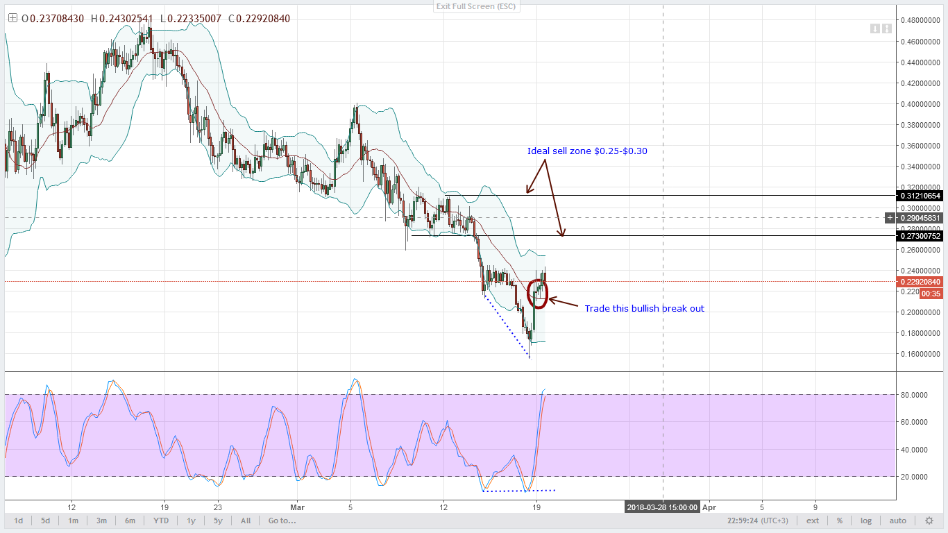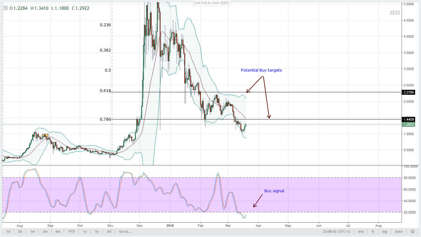 Это хорошие новости для покупателей после недавнего спада цен Lumens. Прежде, чем найти линию поддержки, я ожидаю, что цены будут расти выше уровня 18 марта. Кроме всего, стохастик показывает сигнал на покупку, и поскольку 19 марта оказалось положительным для быков, покупатели могут размещать входы на четырехчасовом тайм-фрейме, где они могут покупать во время откатов в сторону 20MA.