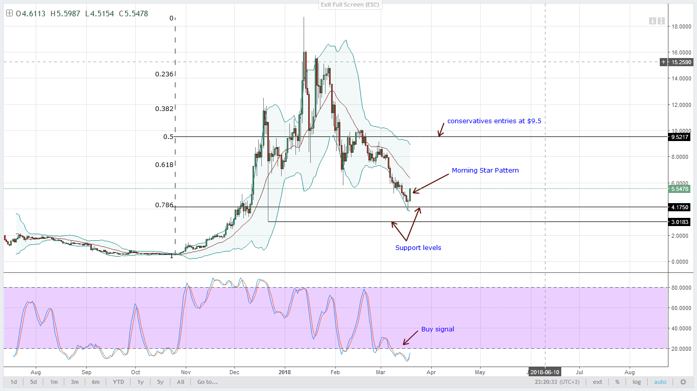 После событий 19 марта, мы четко видим классический паттерн “утренняя звезда”. Кроме того, в наших предыдущих зонах поддержки начал формироваться сигнал покупки, который находится между минимумом 22 декабря в $3 и $4.2.