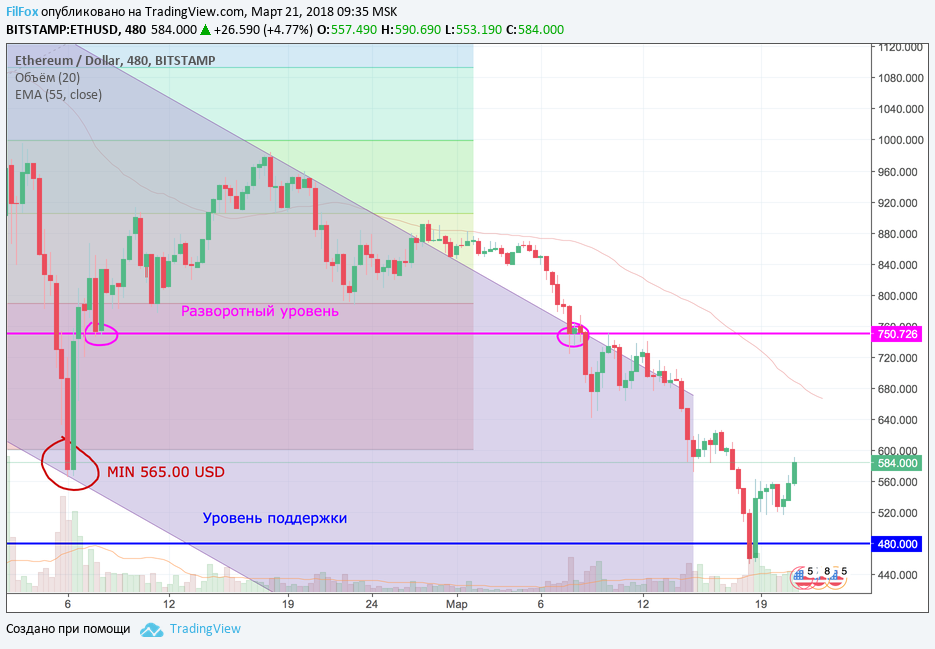 Для нас это будет означать пробой верхней границы феолетового коридора нисходящего тренда и закрепление цены выше этой границы. Но подтверждением разворота и смены даун тренда на восходящий тренд, будет служить только пробой уровня 11500.00 USD и закрепление цены выше уровня 12000.00 USD. Об этом мы уже неоднократно упоминали в своих обзорах, когда 20 февраля и 5 марта курс предпринимал попытки штурма высоты двеннадцать тысяч долларов за Bitcoin.