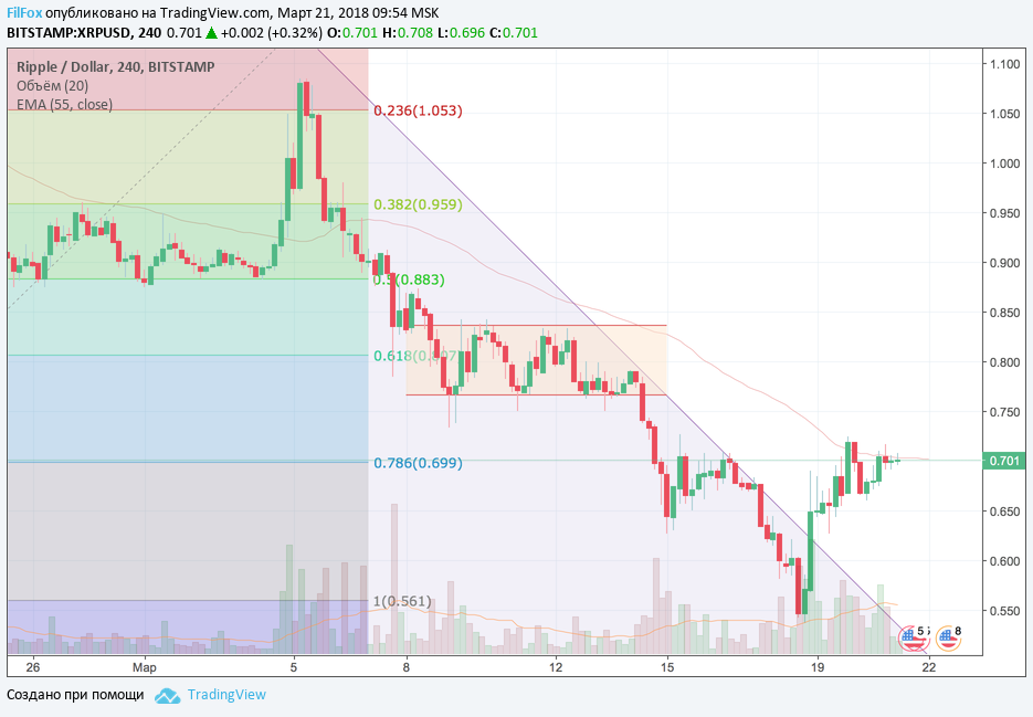 Ripple вчера несколько раз ре-тестил сопротивление EMA55 на четырёхчасовом тайм-фрэйме, но так и не смог его преодолеть. В результате цена на рипл консолидировалась возле уровня 78.6% фибо (0.699 USD), но предполагаемое снижение к уровню поддержки 0.632 USD пока не последовало. На примере Ripple cегодня можно будет понаблюдать насколько выглядят убедительно оптимистические настроения на рынке.