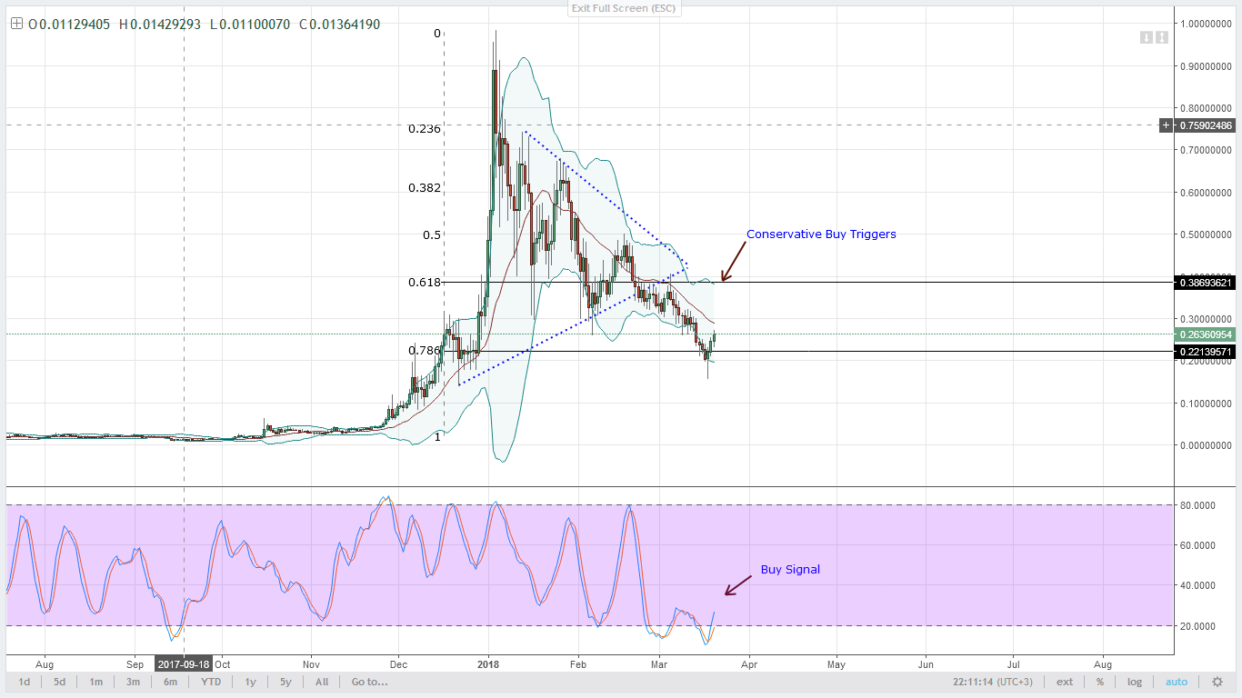 Обратите внимание, что на данный момент цены тестируют среднюю BB и 78.6% фибоначчи. Мой прогноз остается бычьим в краткосрочной перспективе, я рекомендовал бы покупать с целью на отметке $2.2 или 61.8% фибоначчи.
