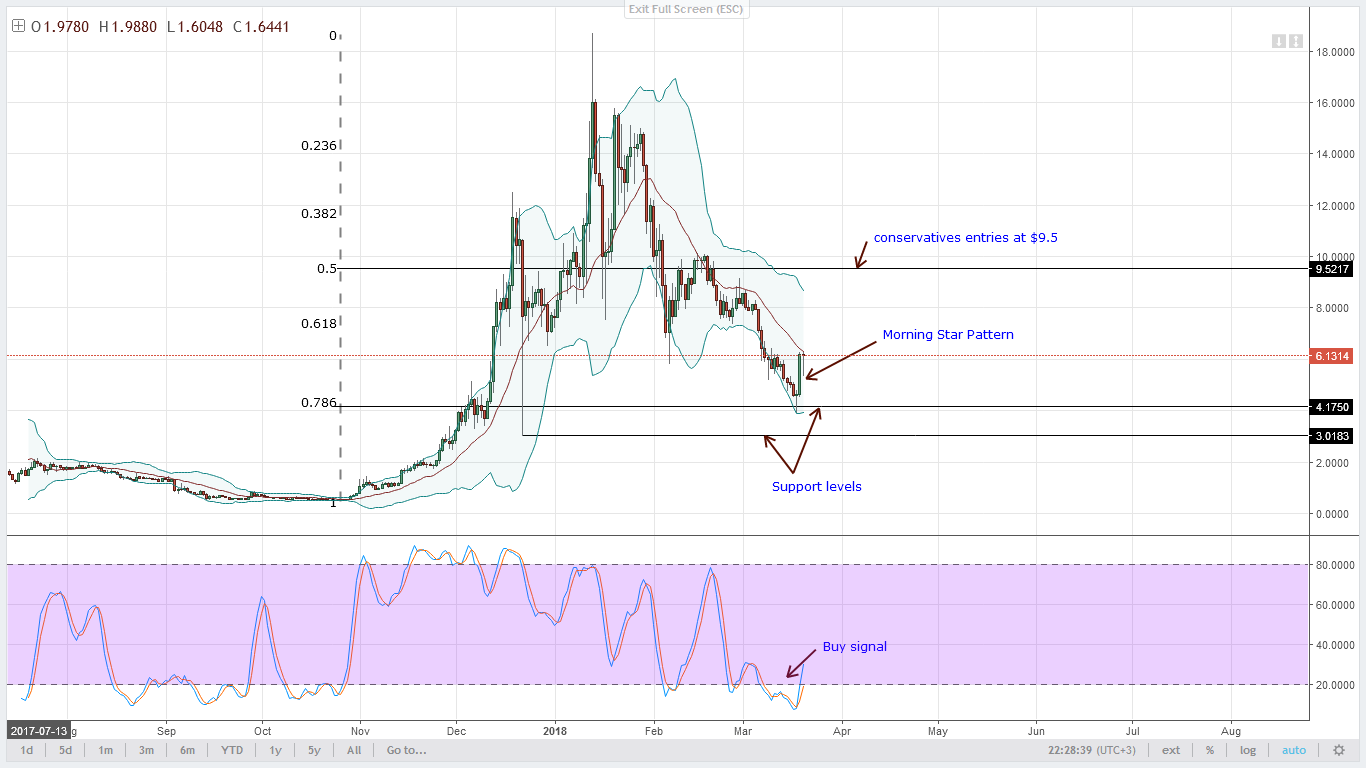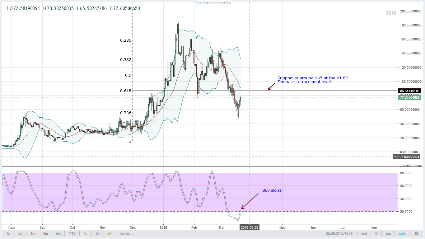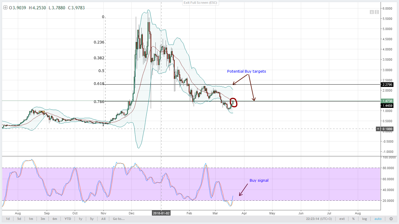 Цены NEO в последний раз торговались выше средней BB в конце февраля. И это несмотря на сильный бычий прорыв, который сейчас происходит. Взгляните на стохастик, и вы увидите сигнал покупки с расходящимися линиями %k и %d.