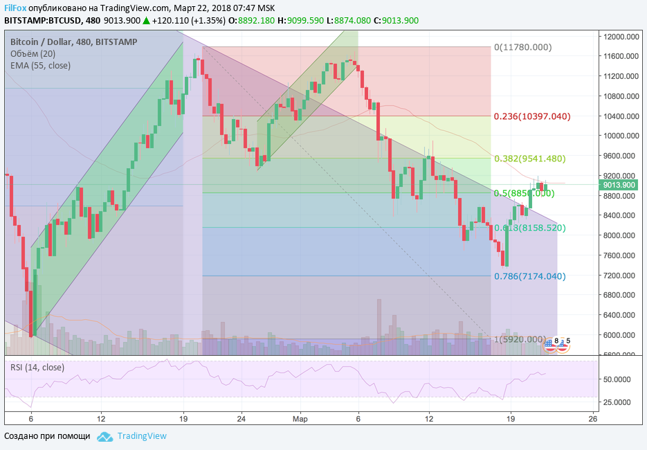 Bitcoin вчера не смог преодолеть уровень сопротивления скользящей средней EMA55 на восьмичасовом тайм-фрэйме. На графике видно, как цена несколько раз тестировала кривую EMA55, но в итоге консолидировалась над уровнем поддержки 50% фибоначи (8850.00 USD). Сегодня после консолидации рост продолжится к вчерашней цели 9 541.00 USD. Уровень 38.2% фибо - это следующий уровень консолидации цены.