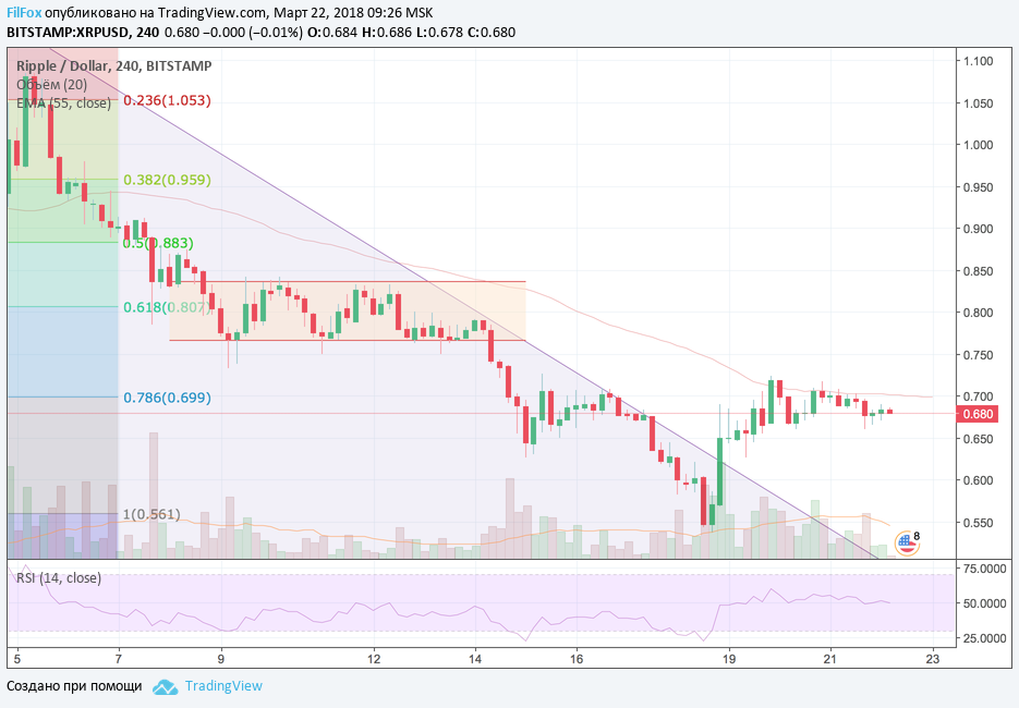 Ripple вчера продолжал пробовать на прочность сопротивление EMA55 на четырёхчасовом тайм-фрэйме, но уже второй день подряд не может его преодолеть. В результате цена на рипл консолидировалась под уровнем 78.6% фибо (0.699 USD). Затухание амплитуды консолидации говорит о подготовке к прорыву EMA55 и консолидации на более высоком уровне сопротивления 0.767 USD.