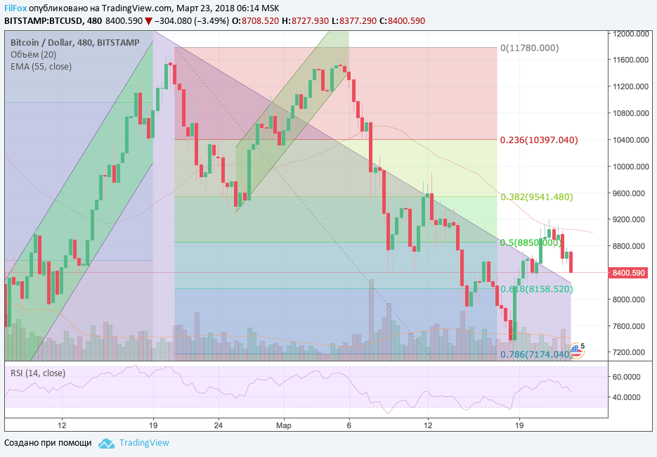 Bitcoin вчера вновь предпринял попытку преодолеть сопротивление скользящей средней, которая на четырёхчасовом тайм-фрэйме снижается вдоль уровня 9 050.00 USD. Но установив дневной максимум на 9099.00 USD, цена под негативным давлением фундаментального новостного фона, начала снижаться к уровню поддержки 68.2% фибо (8158.00 USD). 22 марта на информационном ресурсе Nikkei была опубликована недостоверная информация о требовании японского регулятора FSA (Japan's Financial Services Agencyannounced) к торговой бирже Binance получить соответствующую лицензию.