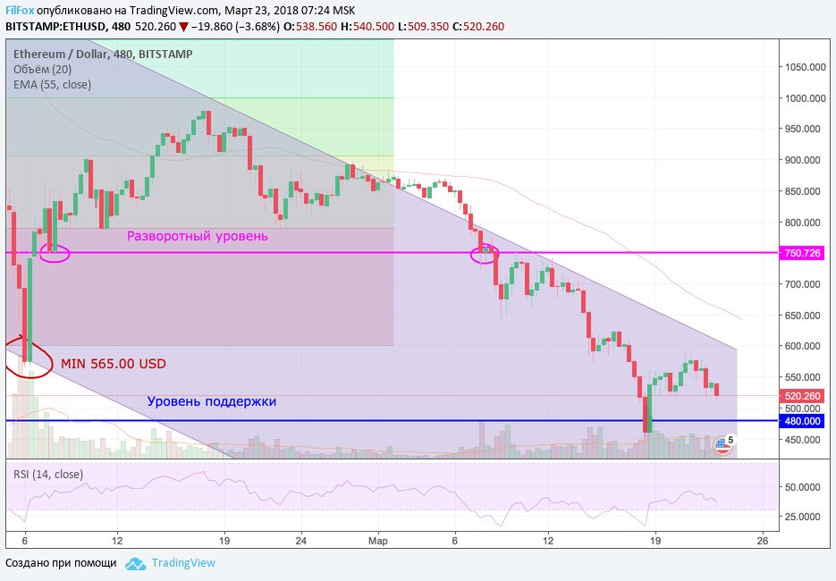 Ethereum не смог вчера преодолеть сопротивление нулевого уровня фибоначи (600.00 USD) и увлекаемый падением пары BTC/USD тоже потерял в курсе. Цена на эфир на данный момент вновь упала ниже минимума 6 февраля и ищет уровень поддержки для консолидации. Если сегодня на рынке не возобновятся позитивные настроения, то снижение будет продолжаться к уровню поддержки 480.00 USD.