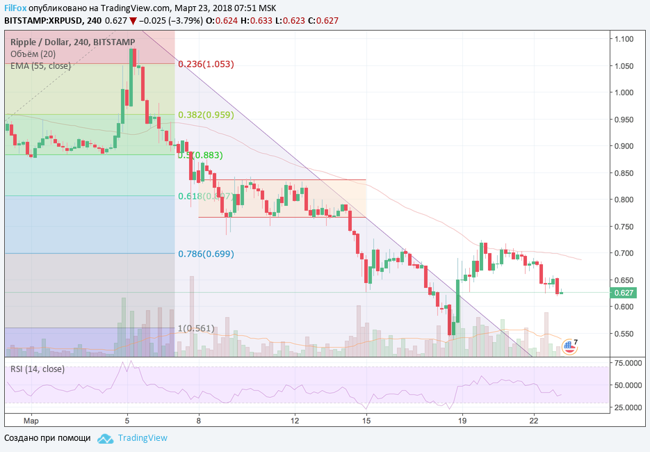 Вчера, после сужения амплитуды консолидации, Ripple получил порцию негативного импульса, в результате которого цена снизилась к дневному минимуму 0.624 USD. При продолжающемся негативном влиянии новостного фона цена может достигнуть уровня 0.595 USD. Если же пара BTC/USD продемонстрирует положительную динамику, то это удержит рипл в боковом диапазоне и приостановит соскальзывание цены.