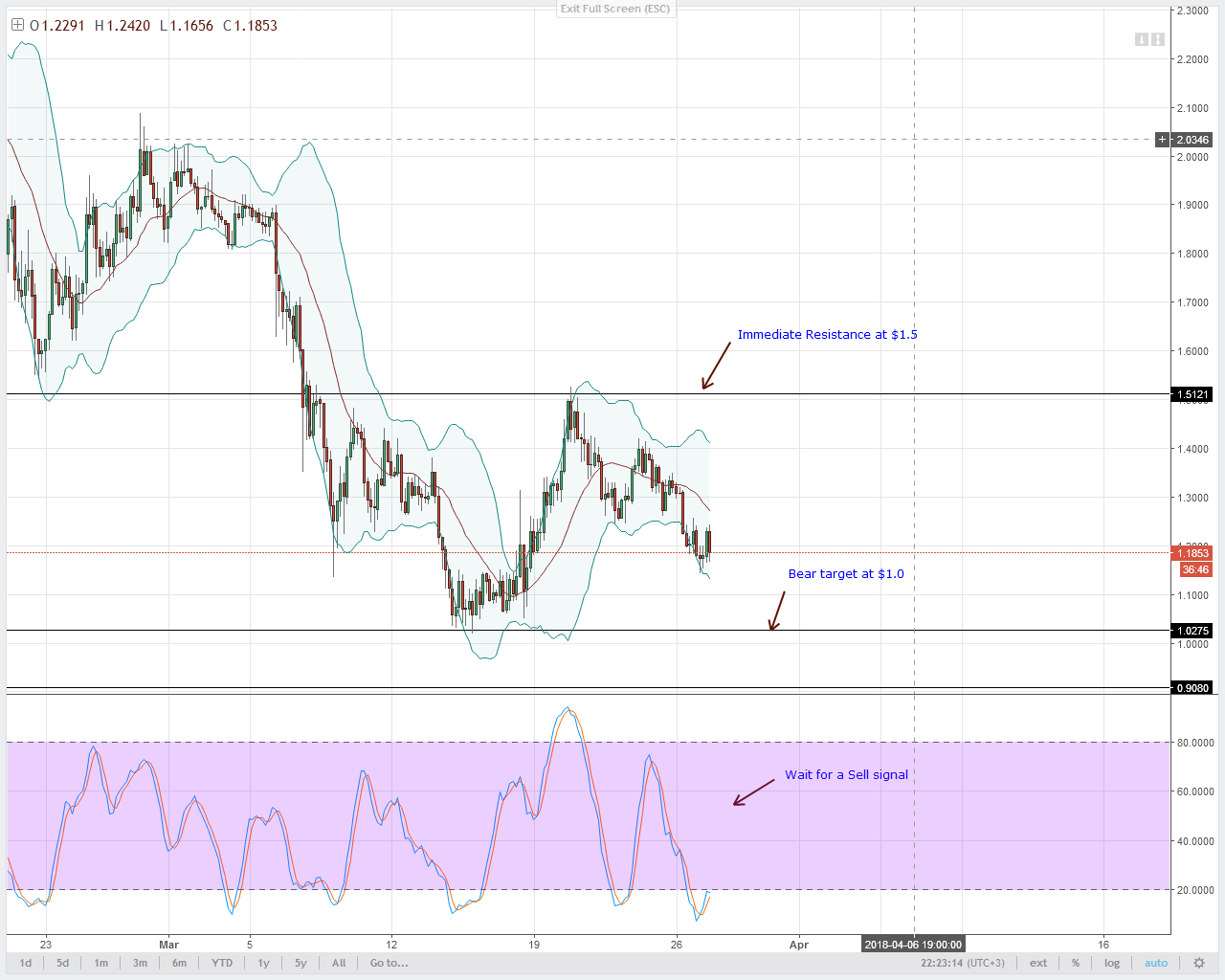 Общая тенденция носит медвежий характер, и хотя покупатели могут поднять цену до $1.4-$1.5 при сигнале стохастика на покупку, эта отметка станет уровнем сопротивления, на котором медведи смогут продавать.