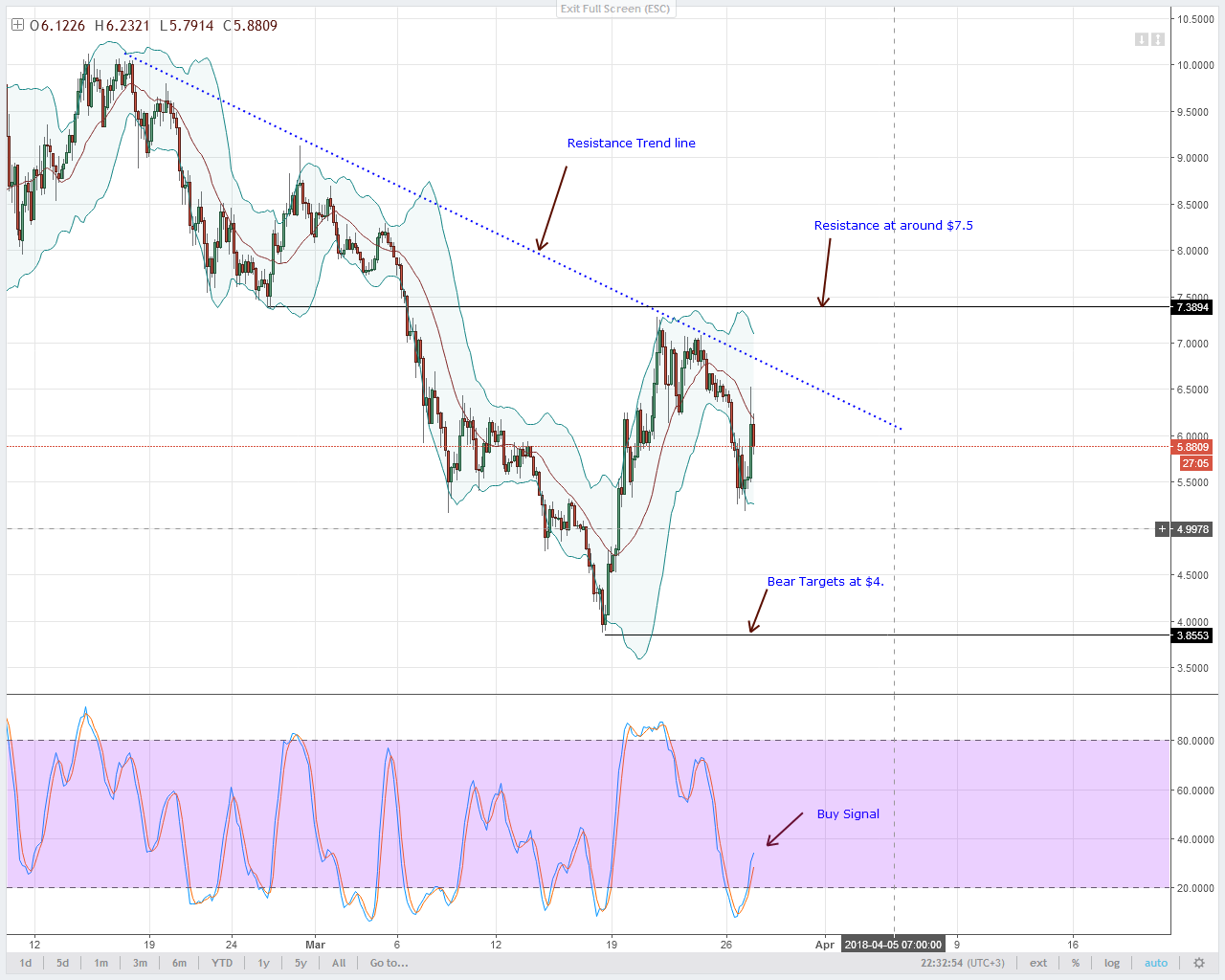 Цена на данный альткоин выросла более чем на 7%. Бычьи цели остаются прежними на отметке $4, продавать можно начинать при сигнале стохастика на отметке $7.5. Активность покупателей, в случае если цена закроется выше $6,5, должна непременно увеличиться.