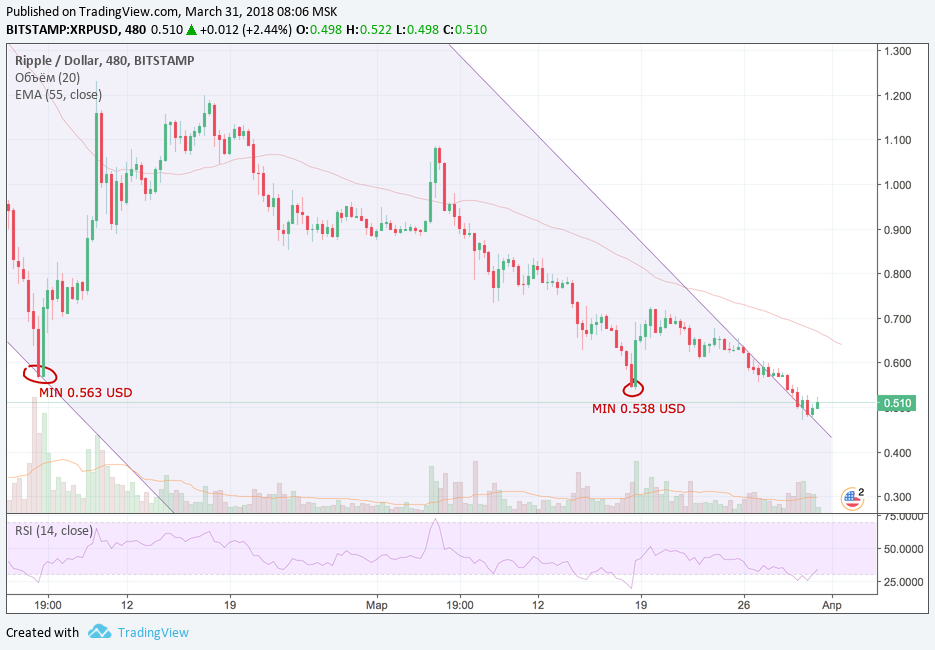 Воспользовавшись восстановлением пары BTC/USD, пара XRP/USD тоже смогла немного отыграть утраченные в пятницу позиции, обозначив дневной максимум субботы на отметке 0.522 USD. В ближайшее время консолидация XRP завершится и цена вновь протестирует верхнюю границу нисходящего фиолетового коридора, возле которой она топчется начиная с 25 марта, так и не решаясь войти в этот коридор.