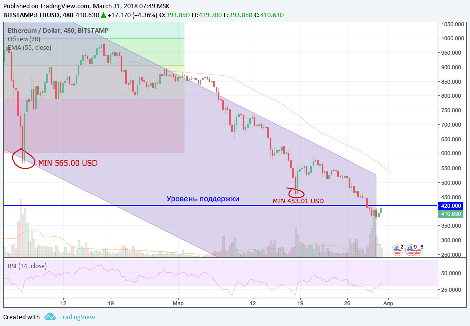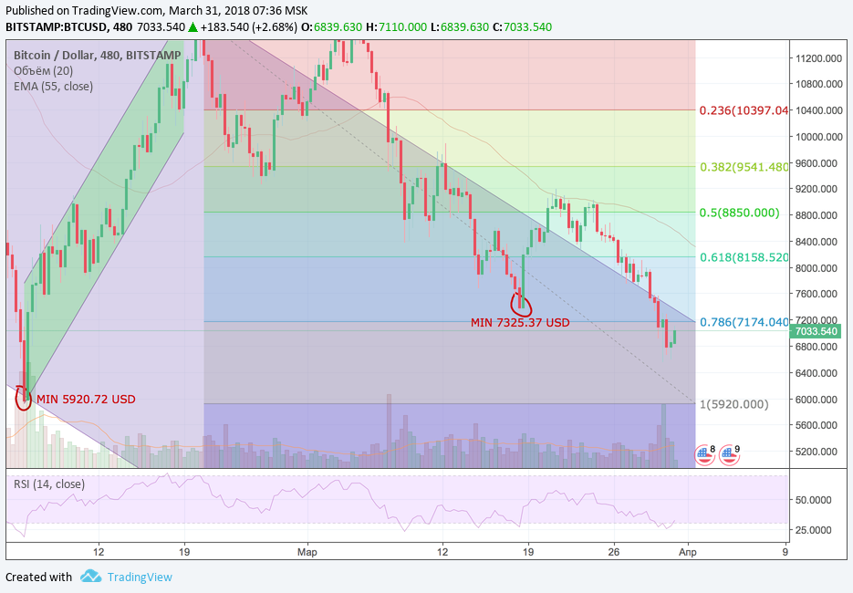 По данным биржи BitStamp, 30 марта Bitcoin установил минимум на отметке 6550.00 USD. Как мы уже упоминали в своём вчерашнем прогнозе, примерно на уровне 6500.00 USD просматривается прошлогодний уровень сопротивления, который вчера выступил поддержкой для падающего курса BTC. В середине ноября 2017 года в области 6500.00 USD цена два дня пробивалась сквозь сопротивление скользящей средней EMA 55. После чего ей открылся путь к двадцати тысячам. Но следует отметить, что 6 февраля цена два раза, как локомотив проносилась сквозь уровень «шесть с половиной тысяч долларов», даже не притормаживая на этом полустанке. Поэтому говорить о том, что уровень 6500.00 USD сможет выступить ключевым уровнем поддержки пары BTC/USD, пока не приходится. Сегодня цена снизу протестирует на прочность верхнюю границу фиолетового коридора нисходящего тренда, которая находится на уровне пересечения с 78.6% фибоначи (7174.00 USD) и попытается консолидироваться в этой области. Однако в ближайшее время курс BTC вновь продолжит снижение к целевому февральскому минимуму 5980.00 USD.