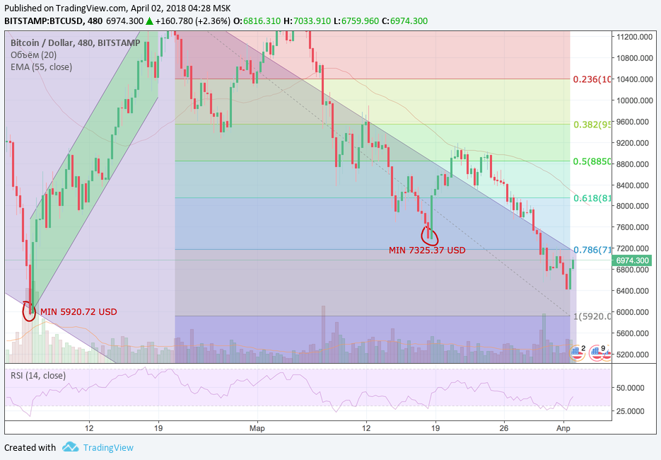 В воскресенье, 1 апреля, цена протестировала уровень 78.6% фибоначи (7 174.00 USD) и продолжила падение. Однако во второй половине дня, когда цены достигли района 6 420.00 долларов, неплохие объёмы покупок смогли вновь сдвинуть цены вверх и сегодня локальный максимум на отметке 7 033.00 USD выглядел как попытка ре-теста верхней границы фиолетового коридора нисходящего тренда. Скользящая средняя EMA55 на часовом тайм-фрэйме выступит ограничительным уровнем такой коррекции.