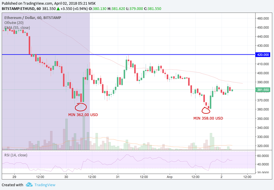 Положительная коррекция пары BTC/USD позволила цене на Ethereum, от первоапрельского минимума (358.00 USD), восстановится чуть выше последнего мартовского минимума (362.00 USD). Как и в случае с парой BTC/USD, ограничителем дневной коррекции пары ETH/USD может выступить скользящая средняя EMA55 на часовом тайм фрэйме. Полагаем, что после завершения коррекции на уровне 380.00 долларов за эфир снижение цены возобновится к уровню поддержки, который находится в районе 333.00 USD.