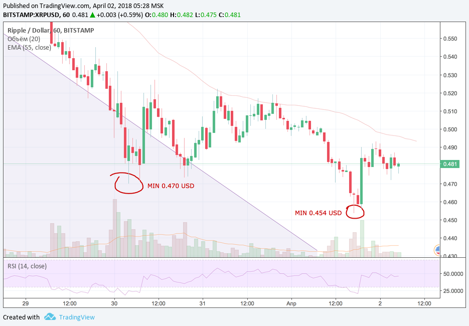 На часовом тайм-фрэйме XRP/USD хорошо видно, как после первого апрельского минимума на отметке 0.454 USD, пара смогла восстановится к скользящей средней EMA55 (0.493 USD), немного не дотянув до психологической отметки «пятьдесят центов за рипл». Как и в случае с ETH и BTC, коррекция XRP тоже будет ограничена EMA55 и после окончания восстановления, рипл продолжит снижение к уровню поддержки 0.450 USD. Сегодняшняя динамика Ripple будет выглядеть как боковик в довольно узком диапазоне (0.493 USD - 0.450 USD).