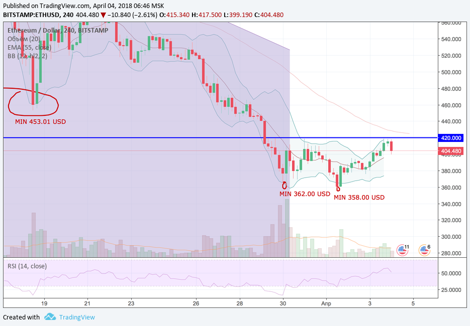 Так как вчера пара BTC/USD демонстрировала положительную динамику, то цена Ethereum, находясь весь день выше средней линии Полос Боллинджера, так же стремилась установить новый апрельский максимум. Ограничителем роста пары ETH/USD выступил уровень сопротивления 420.00 USD. Поэтому установив новый максимум на отметке 419.00 USD цена возобновила снижение к недавнему уровню поддержки 380.00 USD.