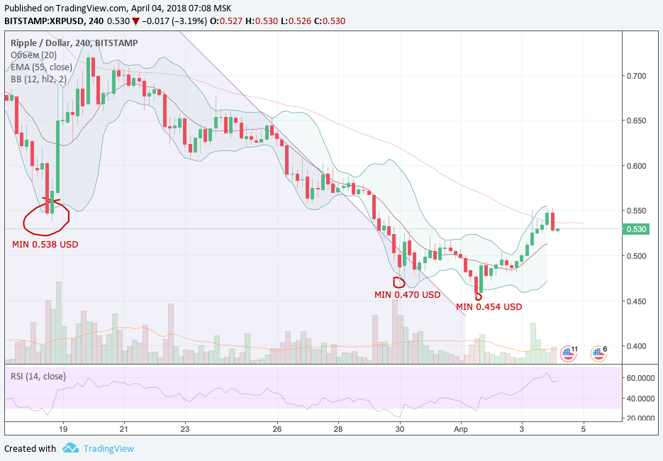 Цена Ripple вчера тоже находилась выше средней линии Полос Боллинджера и её рост ограничивался сопротивлением 0.55 USD. В итоге цена проколола линию сопротивления, установив максимум на отметке 0.553 USD. Полагаем, что на этом коррекция закончится и сегодня цена протестирует среднюю линию Полос Боллинджера.