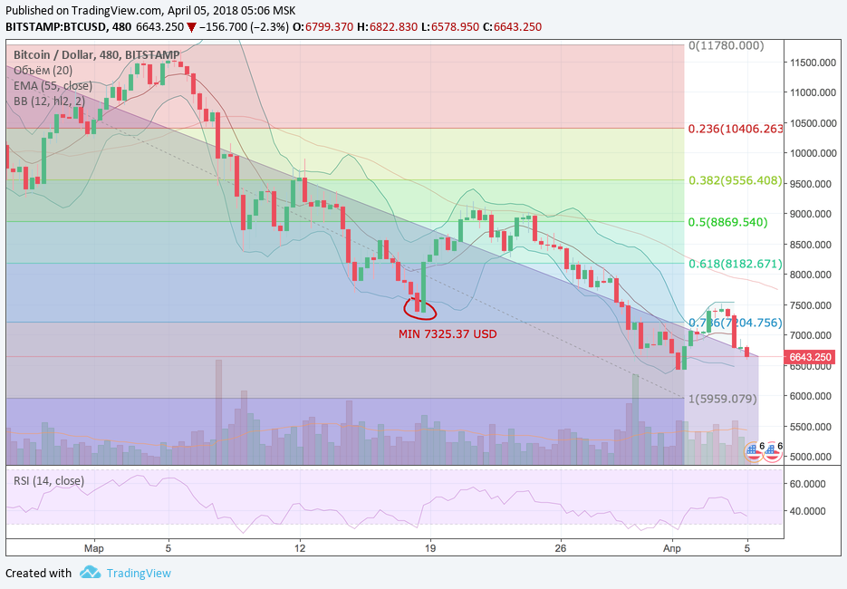 Коррекционное востановление цены BTC завершилось вчера установлением апрельского максимума на отметке 7 506.00 USD. После чего цена возобновила снижение и уже к концу дня ре-тестила верхнюю границу фиолетового коридора глобального даун-тренда.