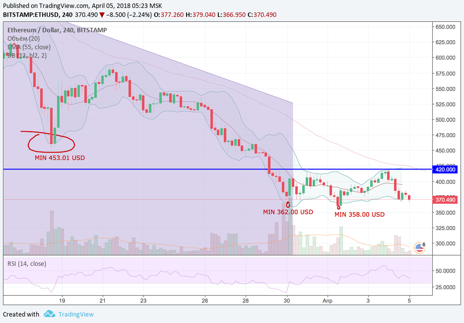 Ethereum апрельский максимум оставил на отметке 419.00 USD. Вчерашнее снижение перешло в консолидацию на нижней полосе Болинджера, достигнув уровня 370.00 долларов за эфир. Однако предыдущие минимумы ещё не обновились. Полагаем, что сегодня консолидация на уровне нижней полосы Боллинджера продолжится, но если медвежья тактика будет такой же агрессивной, как и вчера, то цена обновит первоапрельский минимум, установленный на отметке 358.00 USD.