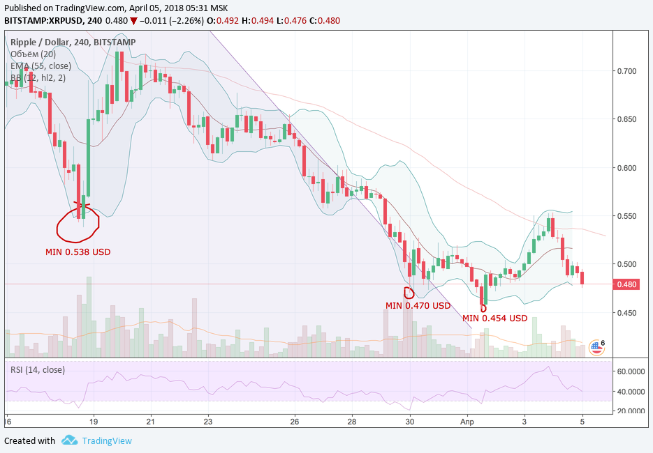 Апрельский максимум Ripple был зафиксирован на уровне 0.553 USD. Падение замедлилось только после того, как цена упала ниже психологического уровня поддержки «пятьдесят центов за рипл». Полагаем, что сегодня, после теста нижней полосы Боллинджера консолидация пары XRP/USD продолжится. При усилении медвежьего давления показатель RSI очень быстро достигнет зоны перекупленности, поэтому вероятность, что первоапрельский минимум (0.454 USD) обновится именно сегодня - очень мала.