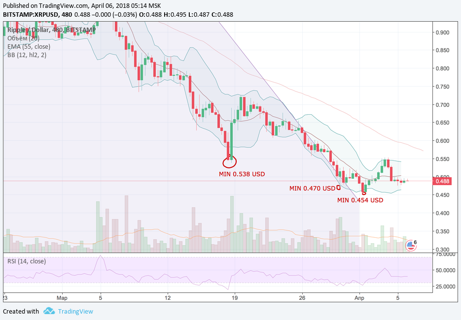 Средняя полоса Боллинджера пары XRP/USD находилась вчера на психологическом уровне «пятьдесят центов за рипл». Для консолидации рипл выбрал узкий диапазон под средней BB (Band Bollinger - Полосой Боллинджера), на уровне 0.49 USD. Таким образом минимальное значение апреля всё ещё сохраняется на отметке 0.454 USD. Полагаем, что долго носить гордое звание «апрельского минимума» уровню 0.454 USD не прийдётся. Уже в ближайшее время, после ре-теста верхней BB, минимум может обновиться.