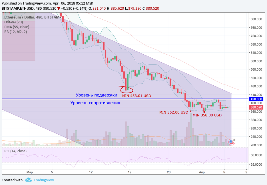 Ethereum для консолидации выбрал уровень поддержки 380.00 USD. На этом уровне цена уже зависала 29-30 марта. А 1 апреля он выступал как уровень сопротивления. Консолидация эфира в узком диапазоне не позволила обновить ни мартовский, ни первоапрельский минимум. Скорее всего это произойдёт в ближайшее время, после выхода из консолидации и ре-теста верхней полосы Болинджера.