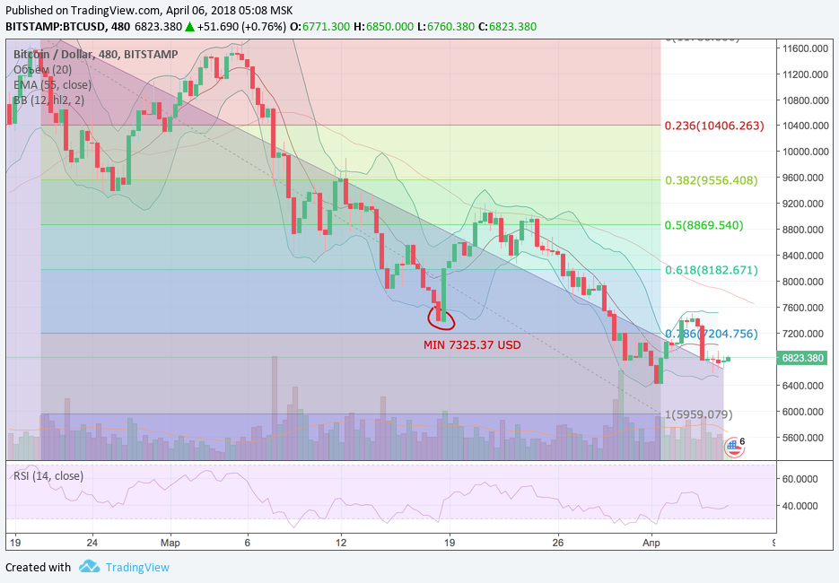 Вчера Bitcoin в попытке протестировать нижнюю полосу Боллинджера, проколол верхнюю границу нисходящего коридора даун-тренда и установил дневной минимум на отметке 6578.00 USD. Однако прорыв верхней границы фиолетового коридора не произошел. Цена протестировала верхнюю границу снизу вверх и вышла из коридора, предпочитая консолидироваться над верхней границей, а не под ней.