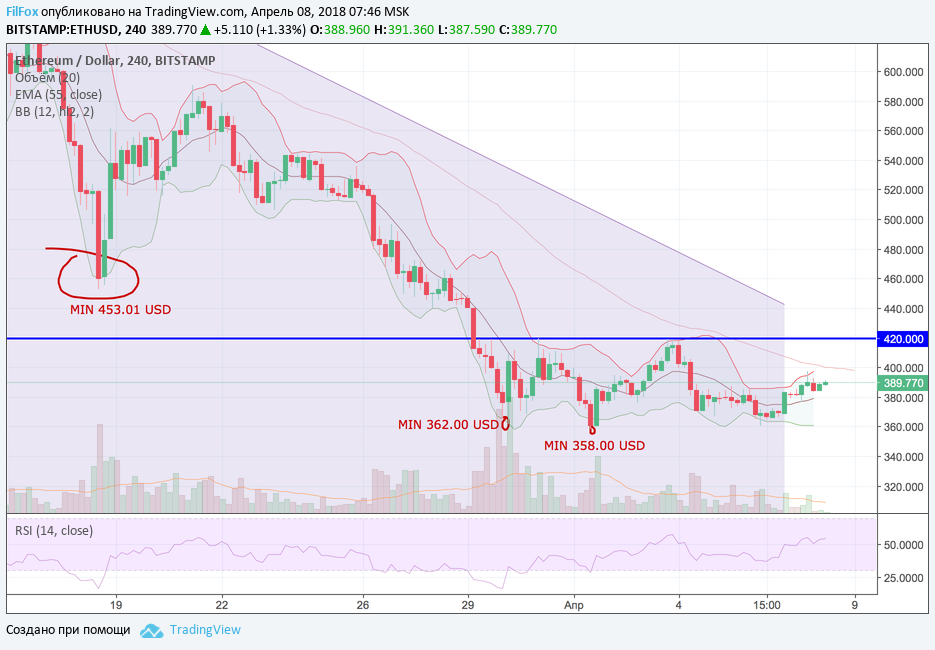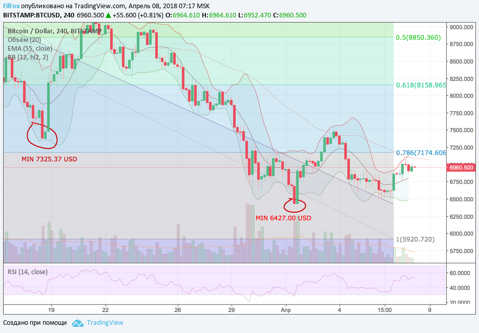По традиции, на границе коридора глобального даун-тренда, цена продолжительное время консолидировалась, не желая заходить в пределы этого фиолетового коридора. Неожиданно оптимизма трейдерам добавила публикация Bloomberg о намерениях фонда Джорджа Сороса заняться макроинвестициями в криптовалюту.