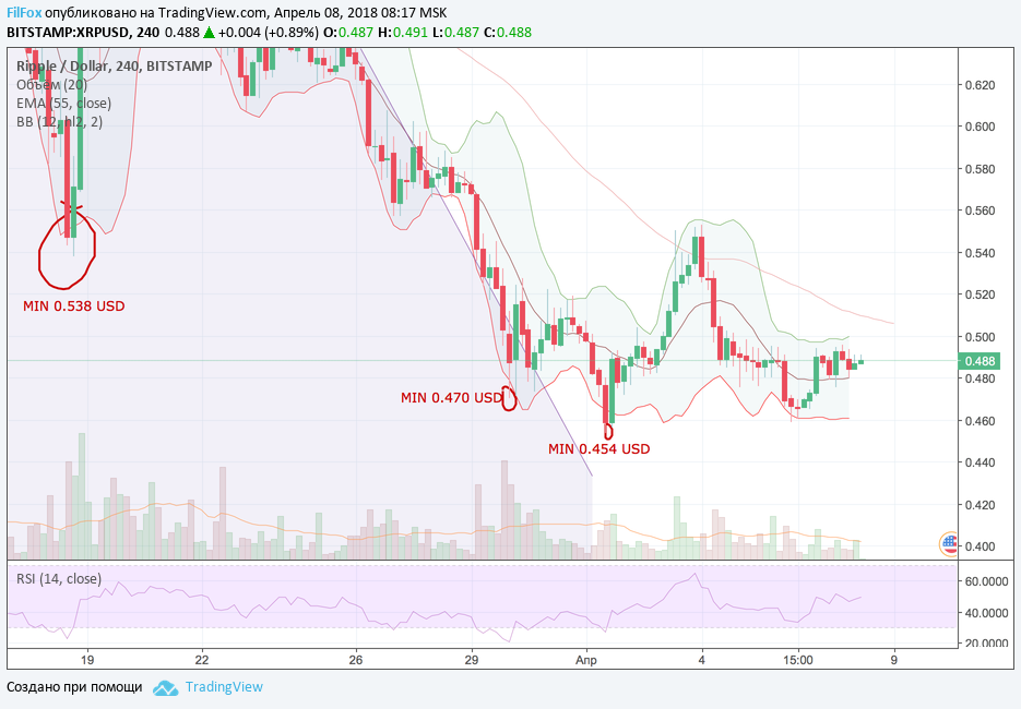 Ripple менее точно копировал динамику BTC и ограничителем роста для него выступал психологический уровень 50 центов за рипл, поэтому недельный максимум он установил на отметке 0.496 USD. В субботу цена протестировала среднюю линию полос Боллинджера и сегодня, полагаем, будет консолидироваться между средней и верхней BB (Band Bollinger)