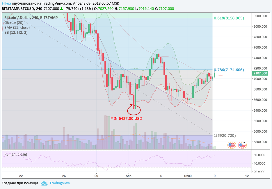 Вчера мы прогнозировали завершение второго коррекционного импульса возле уровня поддержки 6800.00 USD. В воскресенье, цена BTC протестировала среднюю BB (Bollinger Band) установив локальный минимум на отметке 6946.00 USD.