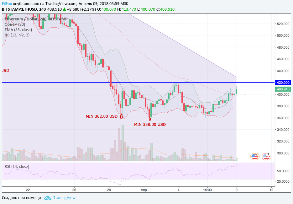Как мы и предполагали во вчерашнем прогнозе, Ethereum не только протестировал уровень скользящей средней ЕМА55 на четырёхчасовом тайм-фрэйме, но и смог закрепиться выше EMA55, установив локальный максимум 410.00 USD. Полагаем, что сегодня коррекционная составляющая завершится, но апрельский максимум устоит на отметке 419.00 USD и не будет обновлён. Показатель RSI уже вплотную подобрался к границе зоны перекупленности, поэтому в ближайшее время ETH возобновит снижение к EMA55 и далее попытается консолидироваться ниже средней BB.
