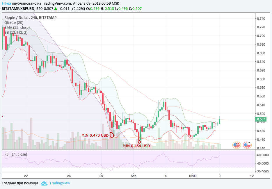 Ripple вчера не ограничился консолидацией в диапазоне между средней и верхней Bollinger Band, а пробив двойное сопротивление психологического уровня «50 центов за рипл» и ЕМА55, установил локальный максимум на отметке 0.513 USD. Этот экстремум станет сегодня отправной точкой постепенного снижения цены XRP и консолидации под уровнем средней линии полос Боллинджера.