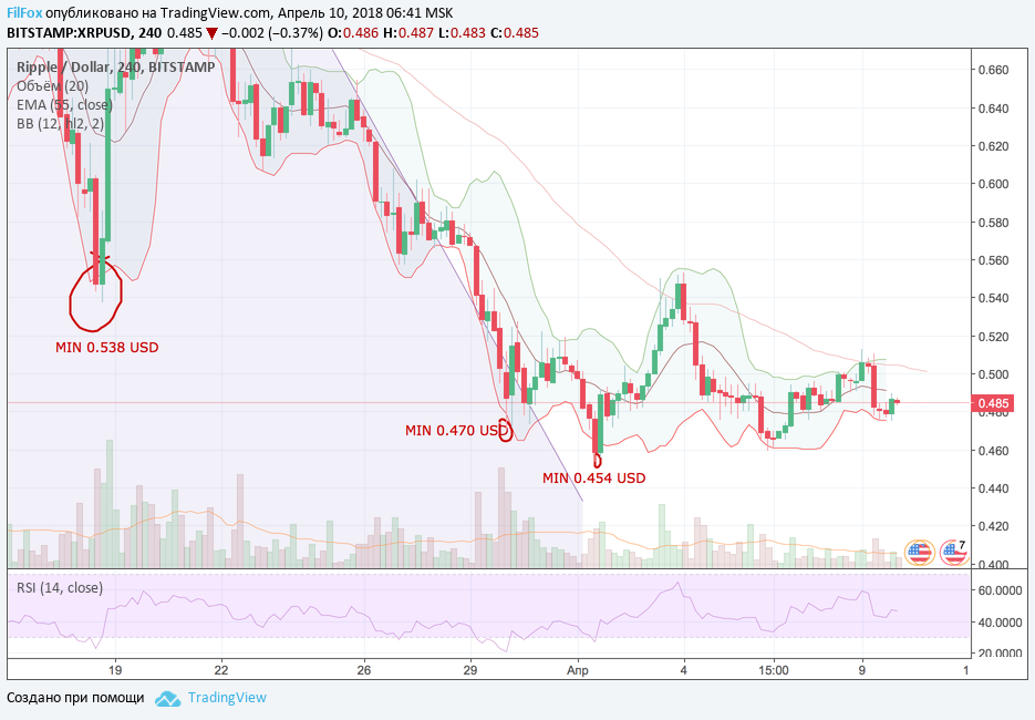 Ripple вчера после локального максимума на отметке 0.513 USD возобновил снижение, пробив среднюю линию полос Боллинджера. Консолидаця продолжилась между средней и нижней ВВ (Bollinger Band). Сегодня снижение продолжится к целевой отметке первоапрельского минимума, а первым уровнем поддержки будет выступать уровень 0.466 USD
