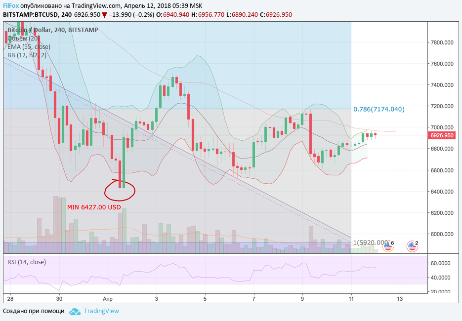 сопротивление EMA55 - пока не ясно. Но если позитивные настроения трейдеров подкрепятся фундаментальными новостями, то пробой уровня скользящей средней может закончится ре-тестом 78.6% фибо (7104.00 USD).