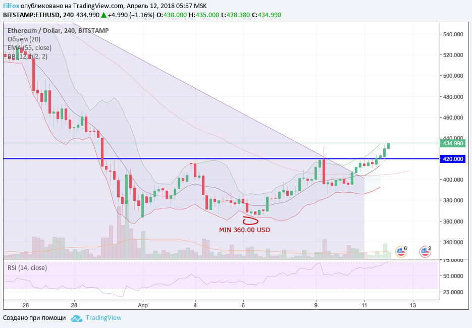 Сегодня рост ещё продолжается и на данный момент пара ETH/USD торгуется в диапазоне 430.00 - 435.00 долларов за эфир. Продолжаем наблюдать насколько хватит бычьего запала у покупателей. Полагаем, что цена не сможет сегодня пробить сопротивление, находящееся на уровне 445.00 USD.