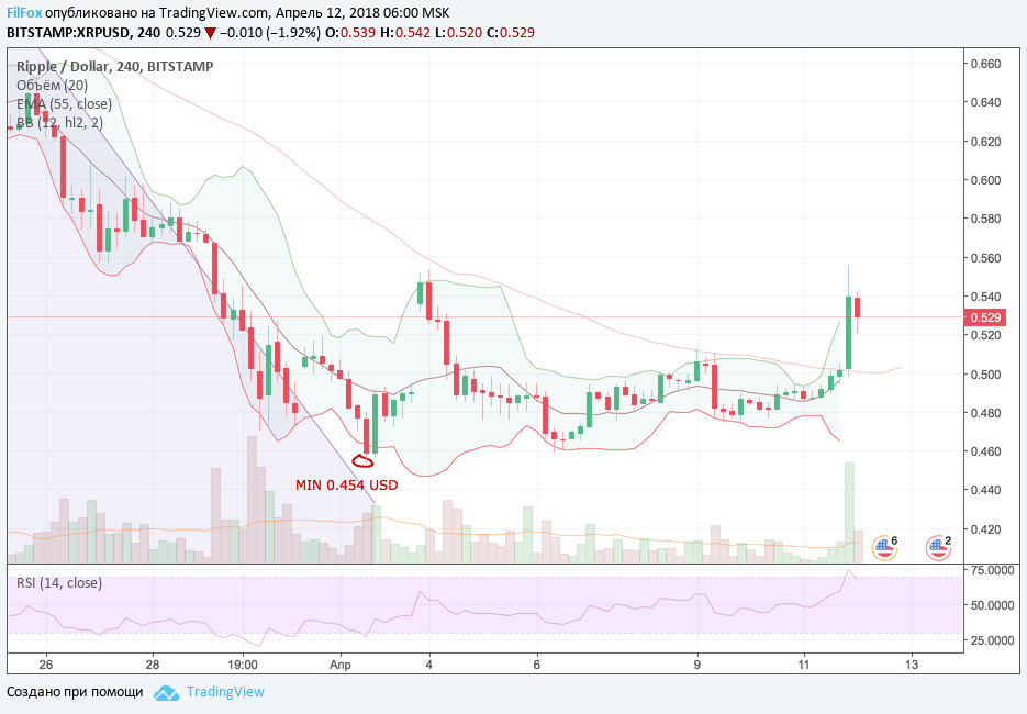 Ripple вчера демонстрировал интенсивный рост, потому что во второй половине дня начали резко расти объёмы покупок. Цена пробила уровень сопротивления скользящей средней EMA55 и установила максимум на отметке 0.556 USD.