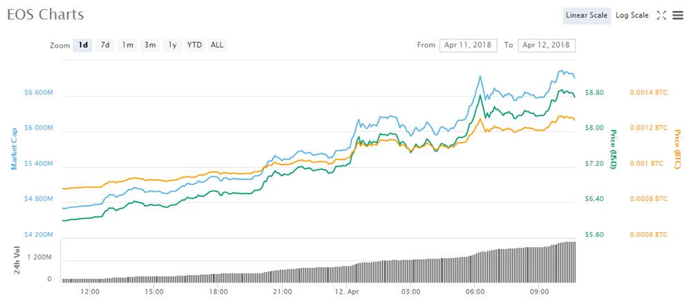 Согласно данным Coinmarketcap, цена EOS выросла на 45%. Вчера в это время альткоин торговался по цене $6, сегодня она составляет $8.8. На месячном графике мы также видим прирост в 45%, так как последние четыре недели EOS торговался в пределах отметки $6. Причиной прироста является этот бычьий прорыв. В паре с биткойном EOS также вырос на 45%, теперь он торгуется по цене 127000 сатоши, вчера в это же время цена составляла 87800 сатоши. Месячный прирост EOS в паре с биткойном гораздо больше, EOS удвоил стоимость по сравнению с 63000 в прошлом месяце.
