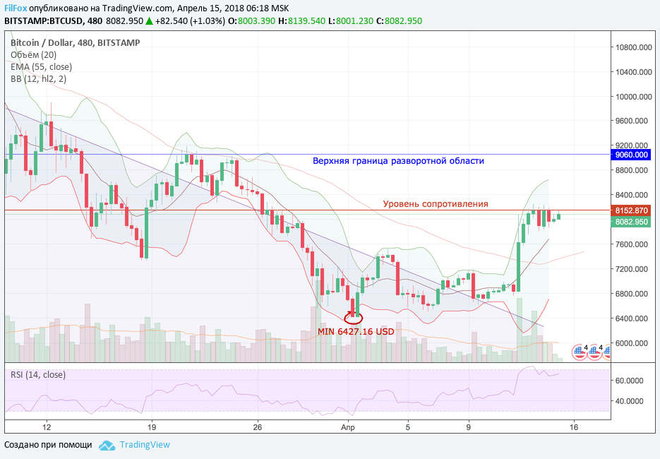 Понедельник уходящей недели начался с возобновления падения цены Bitcoin. Девятого апреля пара BTC/USD снизилась примерно на 5%, установив локальный минимум на отметке 6 611.00 USD. На протяжении последующих двух дней движение цены напоминало консолидацию и восстановление после резкого спада. В четверг цена упёрлась в сопротивление, образованное скользящей средней EMA55, на уровне 6900.00 USD. А в среду мы предположили, что если покупателям удасться продавить этот уровень сопротивления, то цена может протестировать фибоначи 78.6% (7104.00 USD). Но 12 апреля, в Международный День Космонавтики, цена BTC, как на ракете, взлетела к вершине 8069.00 USD, установив там дневной максимум.
