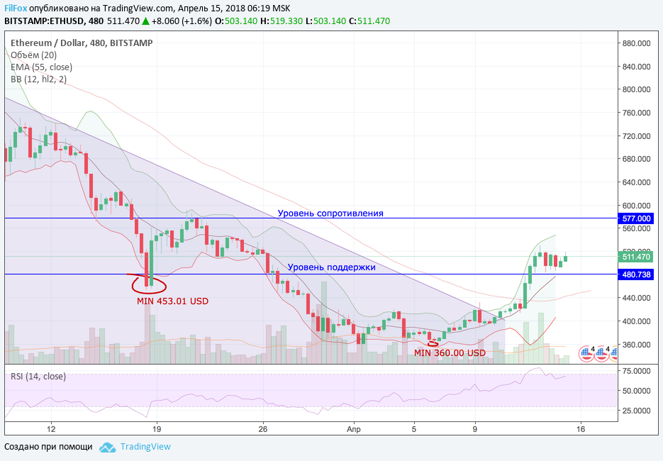 На первый взгляд, динамика Ethereum полностью повторяла динамику пары BTC/USD. Но на четырёхчасовом тайм-фрэйме можно заметить, что пара ETH/USD с незначительным опережением начала уверенный «весенний рост», однако дневные максимумы устанавливала синхронно. В результате апрельский максимум установлен в пятницу на отметке 529.36 USD. А сегодня цена предпримет очередную попытку пробить сопротивление на уровне 512.00 USD. Так как показатель RSI находится на границе зоны перекупленности, то, похоже, что цена лишь проколет уровень сопротивления 512.00 USD и не сможет закрепиться выше. Ближайшие уровни поддержки и сопротивления мы обозначивали на графике ещё вчера.
