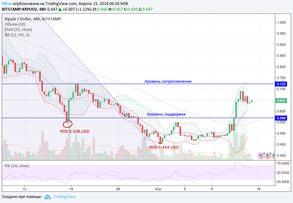 Если бычий импульс пары BTC/USD продолжит двигать цену вверх, то пара XRP/USD сможет протестировать очередной уровень сопротивления 0.722 USD. Иначе сопротивление 0.666 USD вернёт цену к нижней линии BB.