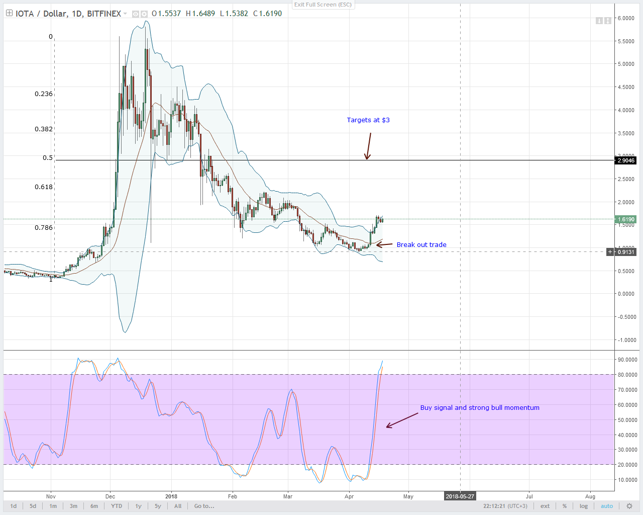 Если посмотреть на возможности покупки IOTA на малых тайм-фреймах и сравнить их с нашим предыдущим теханализом, я думаю, можно смело сказать, что покупатели могут получить серьезную прибыль. В конце концов, за последние 24 часа выросла на 8%, а за последние 7 дней на 43%. Кроме того, сейчас его цена превышает максимум предыдущей недели на 13 центов, поэтому я рекомендовал бы покупать.