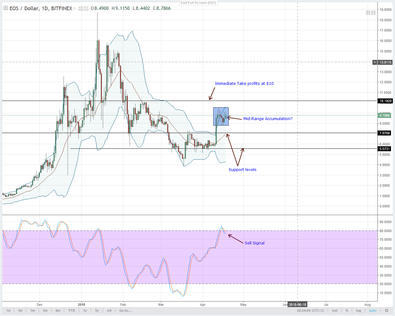 В таком случае стопы стоит разместить ниже отметки $8 и нацеливаться на $16. Независимо от краткосрочных колебаний цен, с приближением июля и приближением запуска основной сети EOS, мы сможем наблюдать значительный рост.