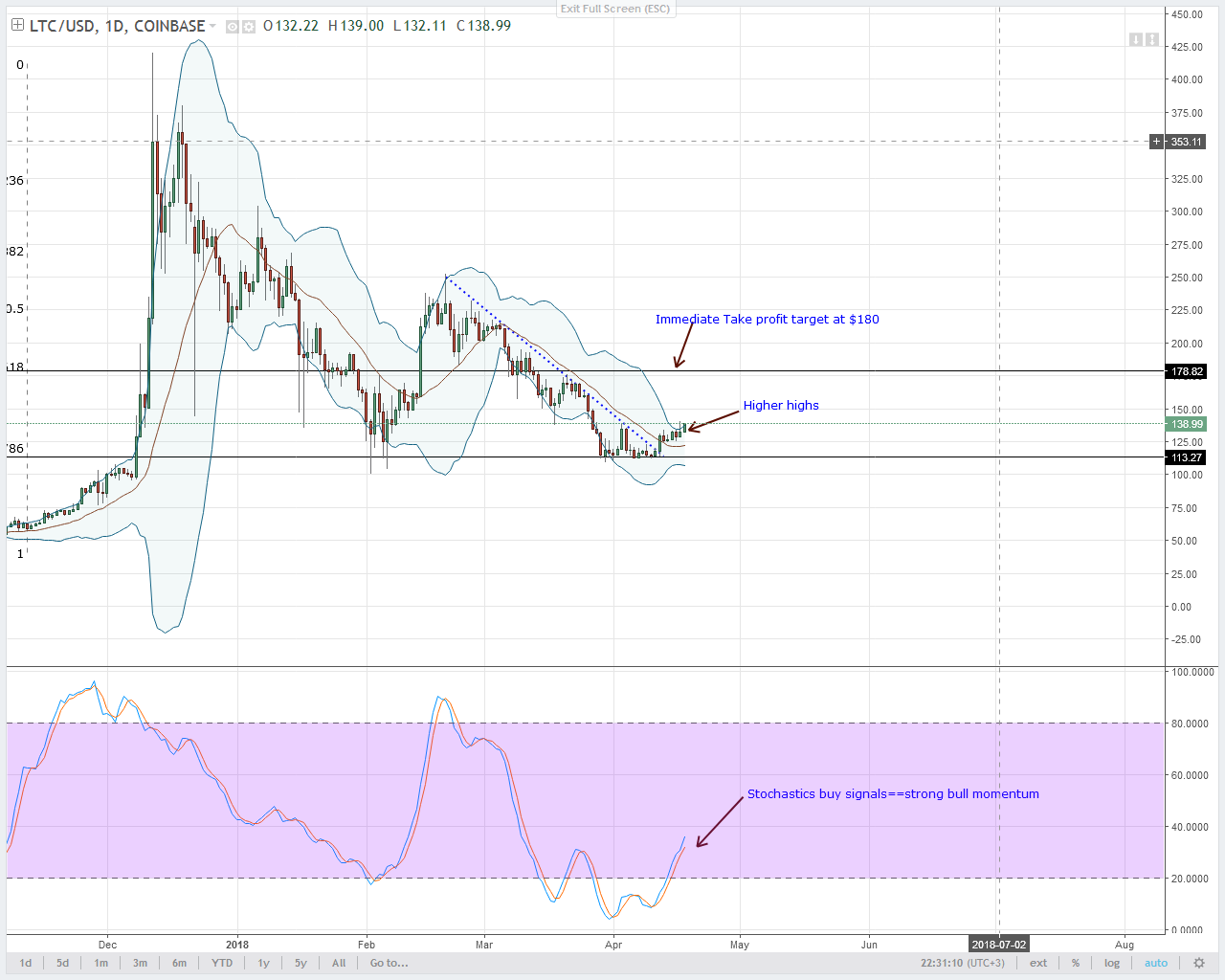 После вчерашнего роста цен, цена Litecoin продемонстрировала бычий прорыв на четырехчасовом тайм фрейме, бычьи свечи теперь находятся выше средней BB. Это все признаки того, что в последующие недели Litecoin будет только набирать в цене, поэтому покупать на провалах на малых тайм-фреймах - хорошая торговая стратегия.