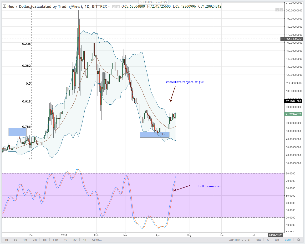 Технически альткоин находится на перекрестке, и если вам нужны доказательства этого - можете взлянуть на свечу 19 апреля. Даже несмотря на то, что цены превышают отметку $70, консервативным трейдерам стоит подождать дальнейшей оценки.