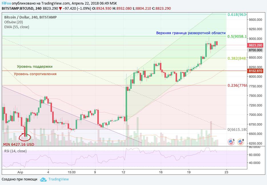 В завершении недели, от этого «прозрачного» уровня поддержки, цена сегодня пробует пробить бетонный потолок в области 9058.00 USD. Напомним, что преодолеть этот рубеж у цены не получалось во время предыдущих мартовских подъёмов 21 и 24 марта 2018 года. После двух неудачных попыток «весенний рост» прекратился и цена продолжила нисходящий тренд, установив 1 апреля минимум - 6427.16 USD.