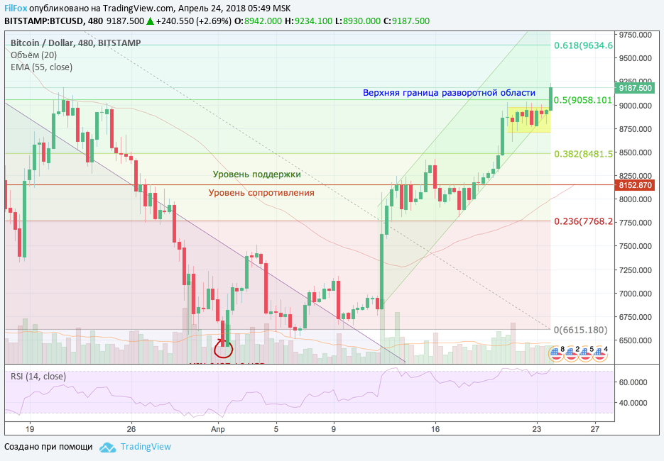 Обращаем внимание, что индикатор RSI уже находится в зоне перекупленности и на средних объёмах покупок цена не сможет надолго закрепиться выше 50% фибоначи (9058.00 USD), для этого нужны объёмы выше средних. Поэтому следующий апрельский максимум будет полностью зависеть от поддержки крупных игроков.