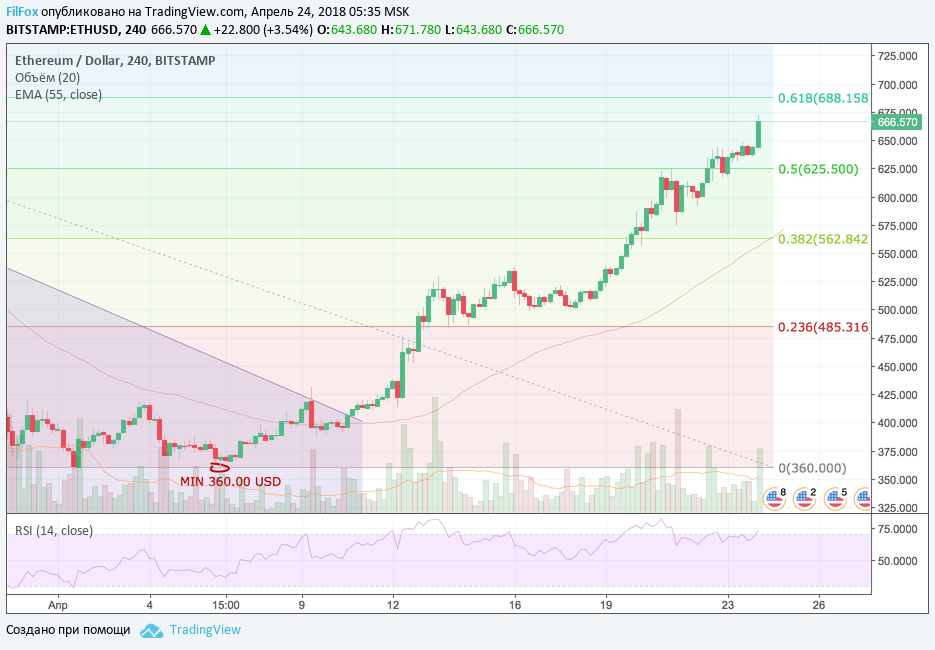 Ethereum вчера закрепившись выше 50% фибо (625.50 USD), даже в боковом диапазоне, смог обновить апрельский максимум до уровня 648.00 USD. Сегодня с утра цена нацелилась на следующий уровень фибоначи 61.8% (688.10 USD).
